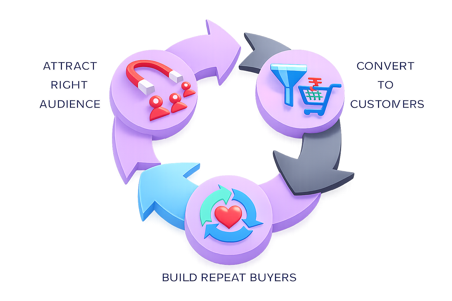 We help you grow by focusing on what actually moves your business forward – attracting the right audience, converting them into paying customers, and keeping them coming back.